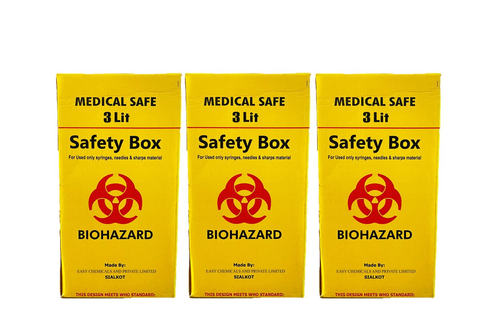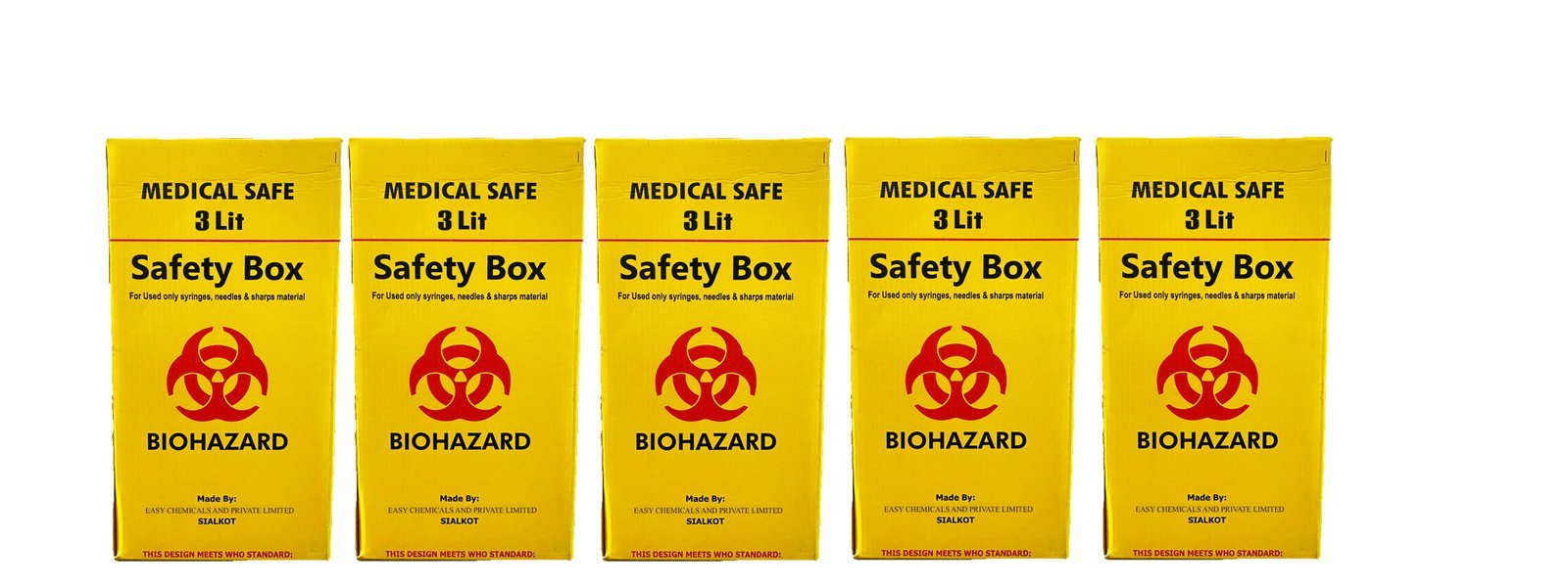 Externally printed with MOH messages on injection safety. Also printed “SAFETY BOX & INCINERATION CONTAINER for USED SYRINGES & NEEDLES,